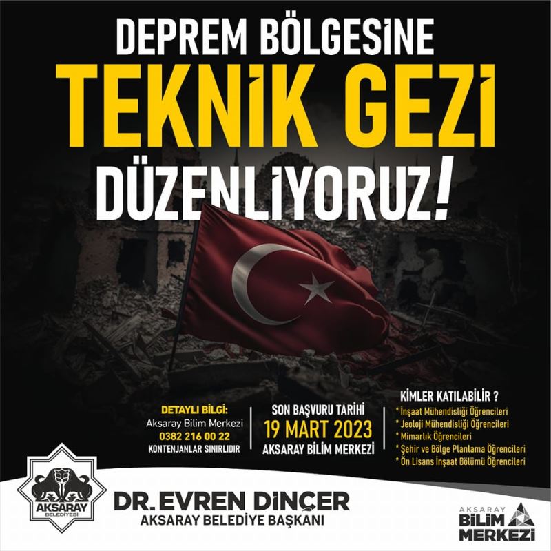 Aksaray Belediyesi ev sahipliğinde düzenlenecek olan teknik gezi ile ilgili açıklamalarda bulunan Belediye Başkanı Dr. Evren Dinçer, teknik gezi ile öğrencilerde deprem farkında oluşturmak istediklerini söyledi. Başkan Dinçer, teknik gezi ile öğrencilerin deprem bölgesini görerek iş hayatlarında hassasiyet göstereceklerini ifade etti.