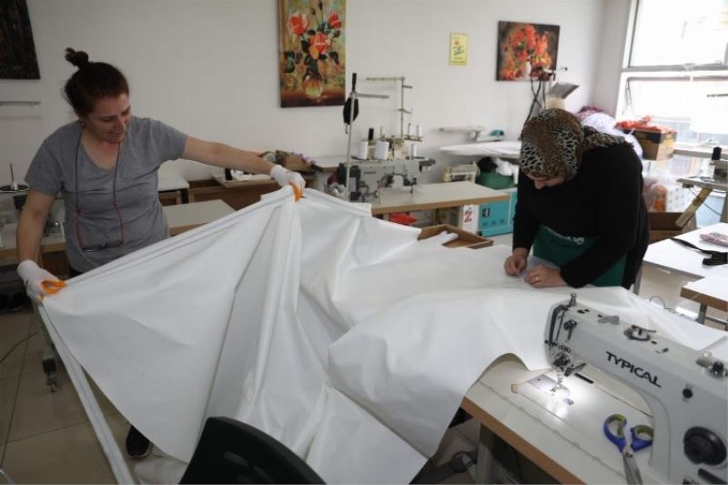 İzmit Belediyesi Çınar Kadın Kooperatifinin üretici kadınları bu kez depremzedeler için dikiş makinalarının başına geçerek çadır dikimine başladı